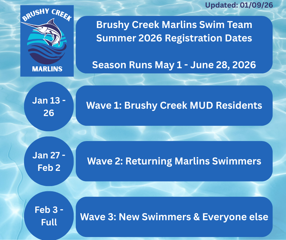 January 13 - 26, 2026: Registration opens for Brushy Creek MUD residents ONLY. If you’re not sure if you are a resident, check your water bill to see if it’s paid to the Brushy Creek MUD.